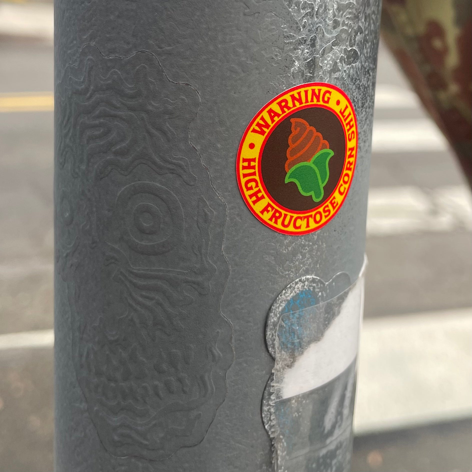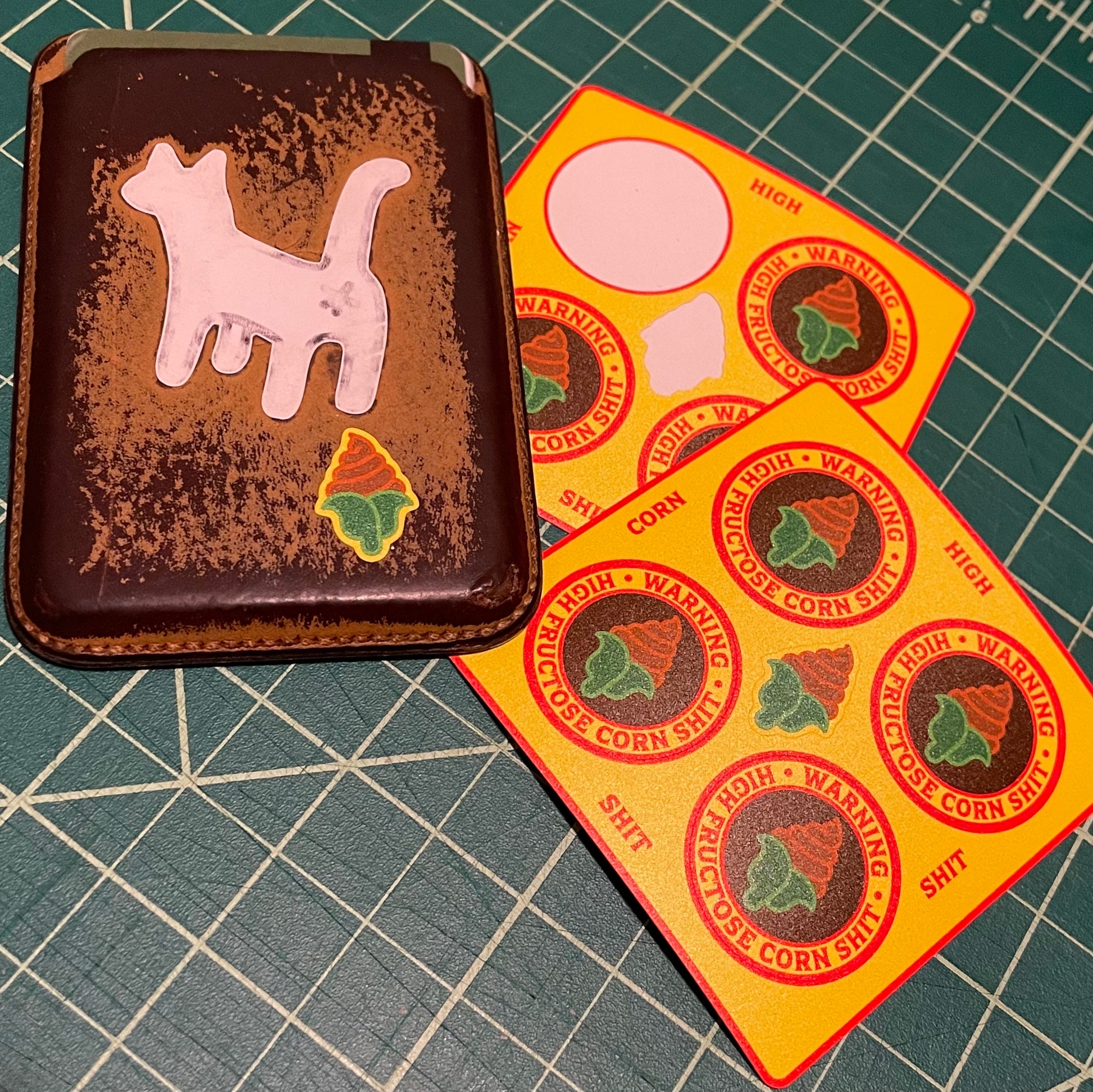 a small sticker sheet with (4) 1" high fructose corn shit stickers and a tiny individual corn shit for your sticking pleasure.